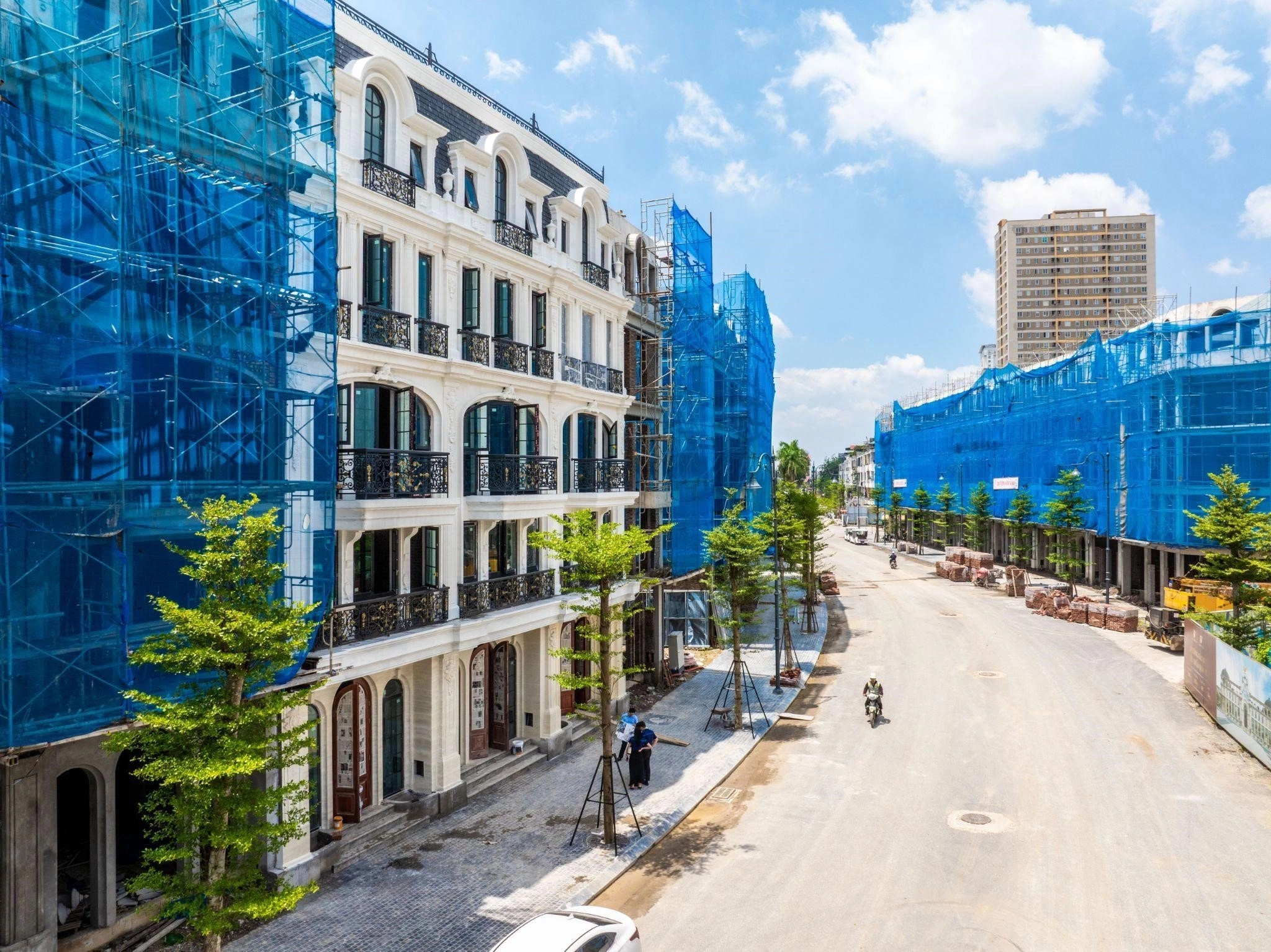 Các căn nhà phố tại dự án được thiết kế theo phong cách châu Âu, sử dụng vật liệu cao cấp và bền vững, thể hiện qua từng chi tiết như phào chỉ hay lan can.